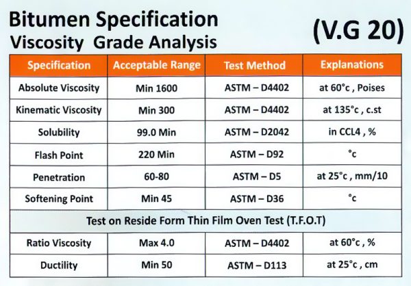 Viscosity Grade Bitumen is classified based on its resistance to flow at specific temperatures. VG20 is tested using instruments like the Brookfield and Saybolt viscometer, following national and international standards such as IS:73 and ASTM D2171. With greater resistance to deformation under high traffic loads, VG20 ensures long-lasting pavement performance and reduces susceptibility to rutting, especially in warmer climates.